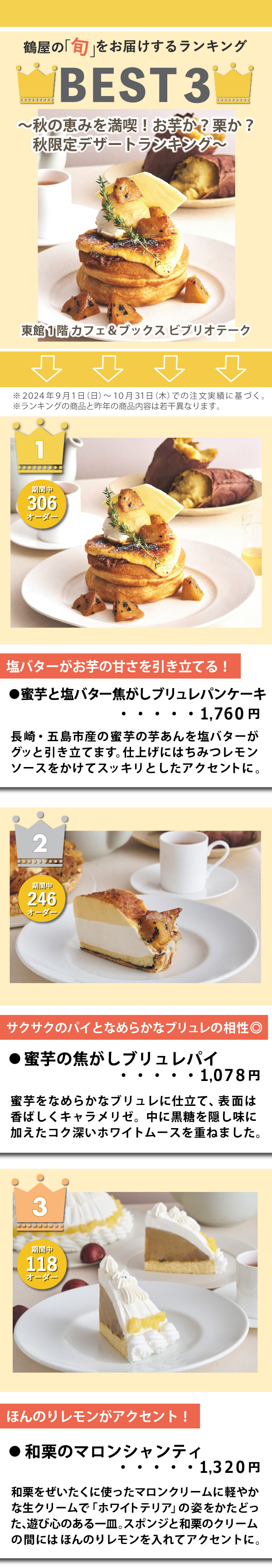 暦の上ではもう秋なんですねぇ。とは言え、まだまだキビシイ残暑が続いておりますが・・・。じゃあ、せめて秋の代名詞、おいしい《芋》と《栗》を食して秋を感じましょう!!本日ご紹介するのは、Yakkoお気に入りの東館1階【カフェ&ブックス ビブリオテーク】より、《秋の恵みを満喫!お芋か?栗か?秋限定デザートランキング》をご紹介します!(2024年9月1日(日)~10月31日(木)での注文実績に基づく。今回のランキングの商品と昨年の商品内容は若干異なります。)