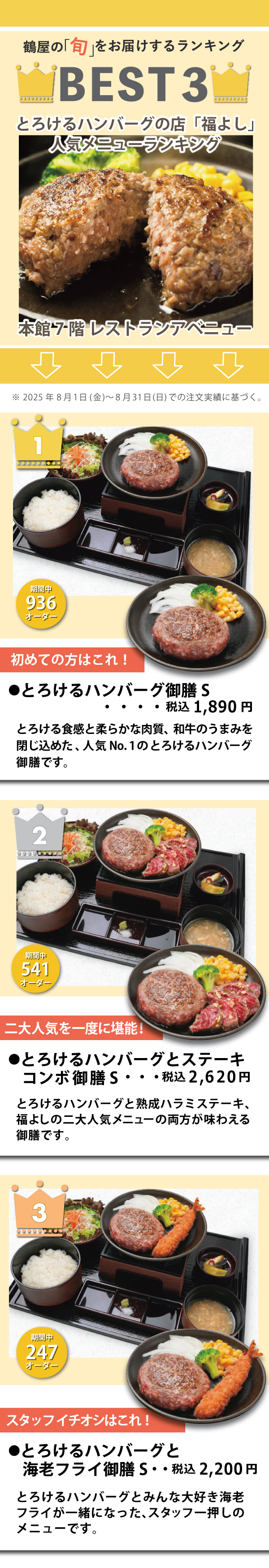 本日ご紹介するのは、7月にオープンした、本館7階レストランアベニュー【とろけるハンバーグ 福よし】のベスト3です!とろける食感と柔らかな肉質、和牛のうま味を閉じ込めた『とろけるハンバーグ』は、国産牛100%、つなぎゼロで、粗挽き手ごねによるもの。お肉の焼けるいい匂いのするそのお店には、お昼時にはいつも行列ができています。卵・小麦粉を不使用なので、アレルギーをお持ちの方も安心。(^^)そんな【とろけるハンバーグ 福よし】の人気のベスト3は!?