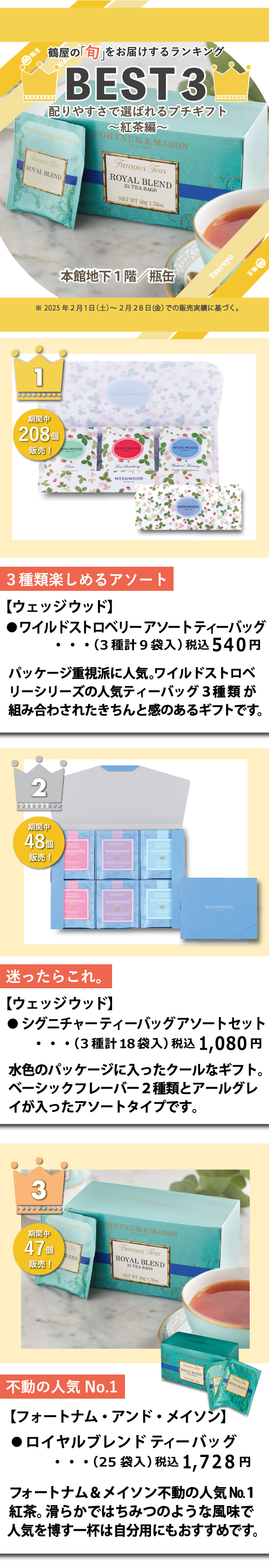 寒い、寒い!2月だから当たり前の寒さかもしれませんが、Yakkoの部屋は特に寒い(Yakko感)!なので、家にいるときはいつも、コーヒー、紅茶など暖かい飲み物をいただきながら暖をとっております。(^^)そして今回ご紹介する《BEST3》は、本館地下1階瓶缶の『配りやすさで選ばれるプチギフト~紅茶編~』。この時期ピッタリの喜ばれる手土産になりますよ~。※2025年2月1日(土)〜2月28日(金)での販売実績に基づく。