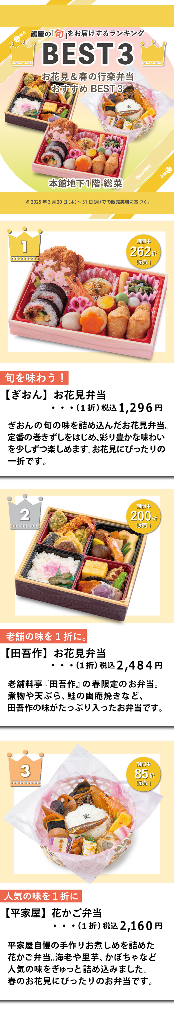 春ですね~。多少の花粉は我慢しながら、外へ出るのが楽しみな季節になってきました!梅の季節が過ぎ、もう少ししたら、桜の季節がやってきます!(^^)本日は、本館地下1階 総菜売場の、見ているだけで春を満喫できる『お花見&春の行楽弁当 おすすめBEST3』をご紹介します!(^^) ※2025年3月20日(木)〜31日(月)での販売実績に基づく。