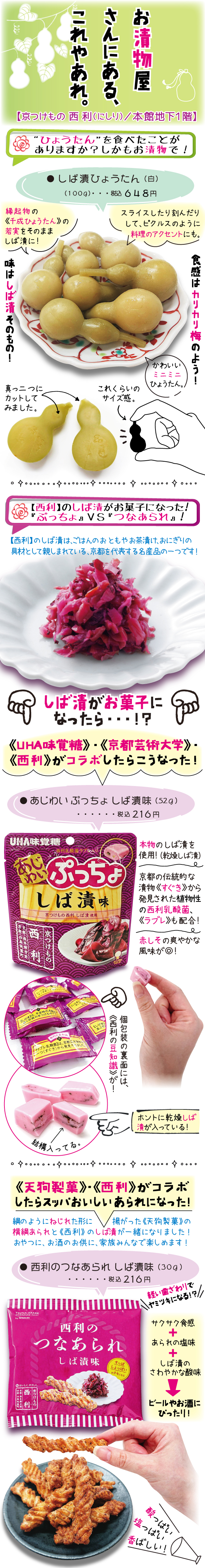 その【京つけもの 西利】に、漬物ではない“お菓子”がありました!(^^)それは、《UHA味覚糖》・《京都芸術大学》・《西利》がコラボした『あじわい ぷっちょ しば漬味』!え~、しば漬味の“ぷっちょ”ってアリ!?と皆思うはず。なのでYakkoは食べてみました。一瞬、梅味?と思うほどフルーティー。中には本当に乾燥しば漬が入っており、乾燥赤しそも入っているので、塩味と風味がちょうどいい和風の“ぷっちょ”に仕上がっています!おまけに京都の伝統的な漬物「すぐき漬」から発見された植物性の乳酸菌『ラブレ菌』も入っております!しば漬味の“ぷっちょ”、アリです。(^^)
