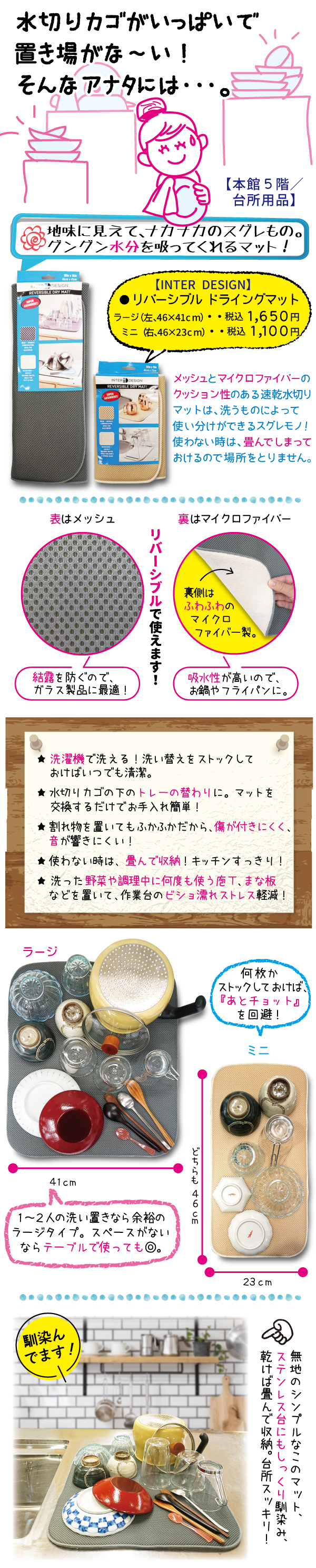 水切りカゴも廃止して、以前から目をつけていた、水切りマットに変更!一見、シンプルで地味なメッシュのマット。でもこれがナカナカの実力派。本館5階 台所用品売場、【INTER DESIGN】の『リバーシブル ドライングマット』は、表はメッシュ加工、裏はふかふかのマイクロファイバーの、リバーシブルで使える水切りマット。通気性のいいメッシュとぐんぐん水気を吸ってくれるマイクロファイバーのナイスコンビ!