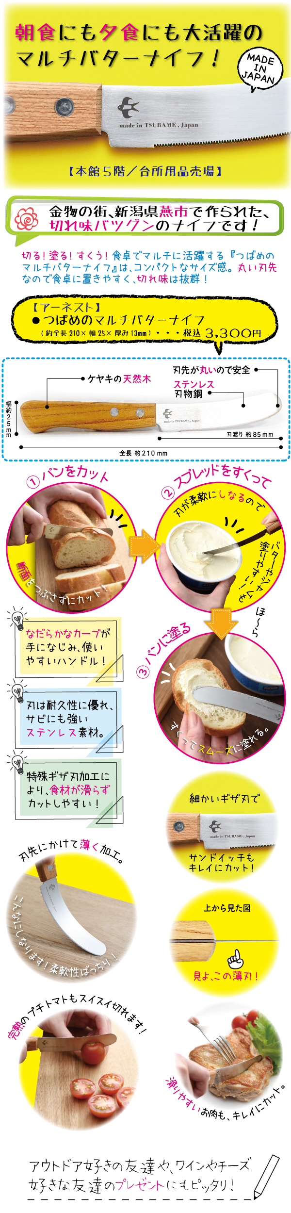 本館5階の台所用品売場の『つばめのマルチバターナイフ』は、金物の街、新潟県燕三条の職人が仕上げた切れ味バッチリのマルチバターナイフ。刃渡り約8.5cm、全長約21cmと、小ぶりでありながら、スゴ腕のナイフなんです。刃は、刃先にかけて薄くなるよう加工。なにしろ薄いので、柔軟性ばっちり。だからジャムやバターも容器からすくいやすいし、塗るのもスムーズ。(^^)細かくギザギザにカットされた刃は、滑りやすい食材もしっかりとらえてカットできます。チーズもバターもテーブルでカット。皮つきのチキンだって、完熟トマトやキウイの皮もスイスイ滑らずにカット!