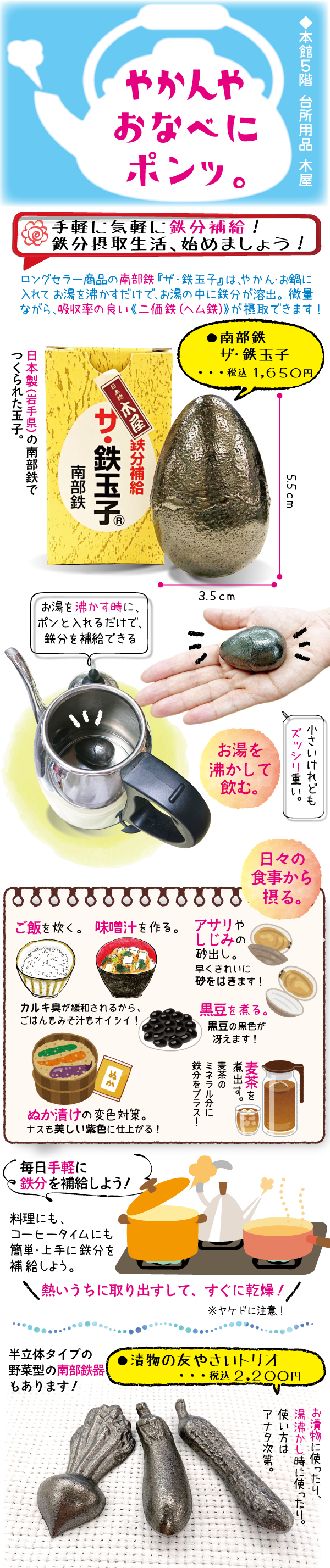 本館5階台所用品【木屋】の『ザ・鉄玉子』!やかんやお鍋でお湯を沸かす時に、入れておくだけで鉄分が溶出するという、ずぼらなYakkoにはうってつけの品。鉄分には、レバー、赤身の肉、赤身の魚などの動物性食品に多く含まれ、体内への吸収率が高いヘム鉄(二価鉄)と、豆、野菜、海藻、卵、乳製品に多く含まれる非ヘム鉄(三価鉄)があります。南部鉄でできた『ザ・鉄玉子』は、溶出は微量でありながらも、吸収率の良いヘム鉄(二価鉄)。この鉄は、タンニンで鉄分の吸収を阻害されることがないらしいので、コーヒー、緑茶もオッケー!(^^)