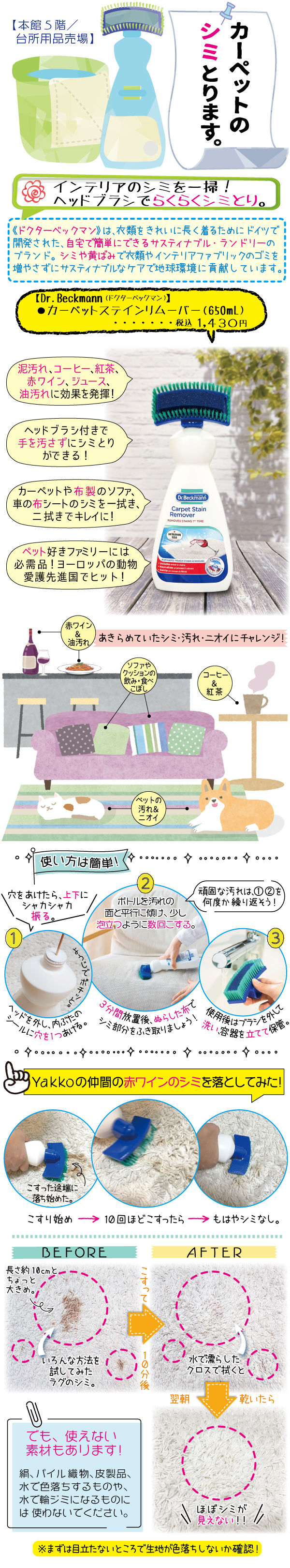 先日本館5階の台所用品売場で、Yakkoが信頼しているドイツ発のシミ取りブランドの『カーペットステインリムーバー』なるものを発見してしまいました!【ドクターベックマン】は、環境への負荷が少ない成分を厳選し、全ての製品が28日間で90%以上生分解し自然に還るという、エコなブランド。