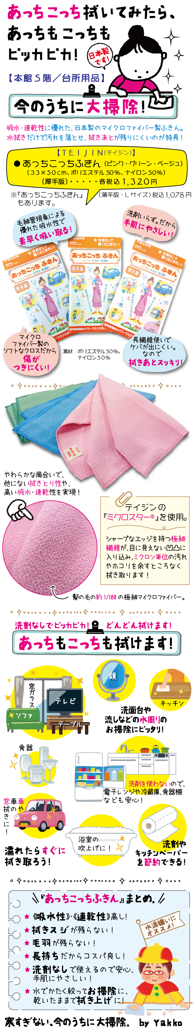 『あっちこっちふきん®』は、【テイジン】の『ミクロスター®』を使用したマイクロファイバーのふきん。極細繊維の高密度微細構造により、水分や汚れを吸い取ります。繊維の毛羽も残りにくく、拭きあがりはスッキリ。(^^)洗剤なしで使えるので、シンクなどキッチンで大活躍!電子レンジや冷蔵庫の中、赤ちゃんやペットなどに使う用具も安心して拭けますよ!(^^)