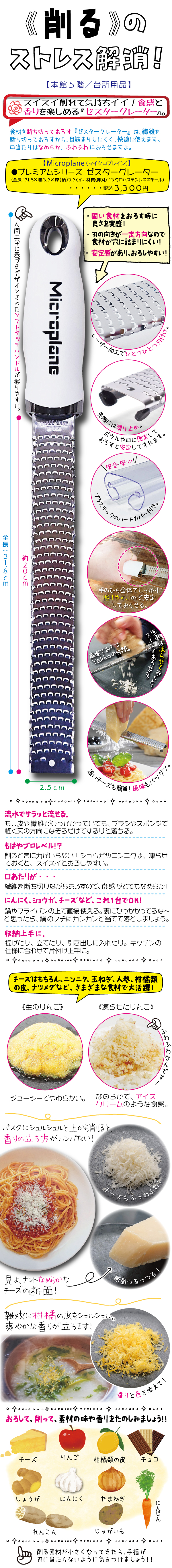 パスタ大好き女子Yakkoです。黒胡椒やニンニクは調理の時にガリガリ、スリスリしていますが、チーズはパルメザンの粉チーズを普通に使っておりました。Yakkoの憧れは、テレビや動画で、出来上がったパスタにシャカシャカとその場でチーズを削っているシーン。そしたら、ありました、その調理器具。(^^)名前は【Microplane】の『ゼスターグレーター』。