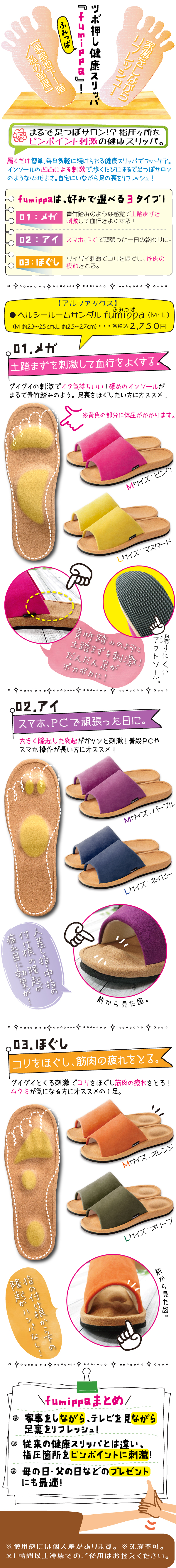 Yakkoはほぼ毎日PCに張り付いて働いております。気づけば前のめりな姿勢。肩をまわしたり、伸びをしたり、日々疲れ目・肩こりとの戦いであります。そんな時、東館の【私の部屋】を通りかかったら、『ふみっぱ(fumippa)』という文字が目に入ってきました。い~や、それスリッパやろ、と思いながらよく見ると、それはインソールに足を刺激する凹凸が付いているスリッパでした。(^^)