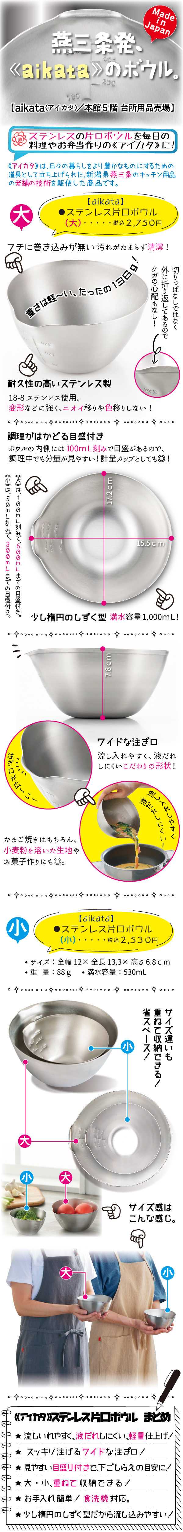 Made in Japan!新潟、燕三条発《aikata》の、ステンレス製、軽~いボウル。