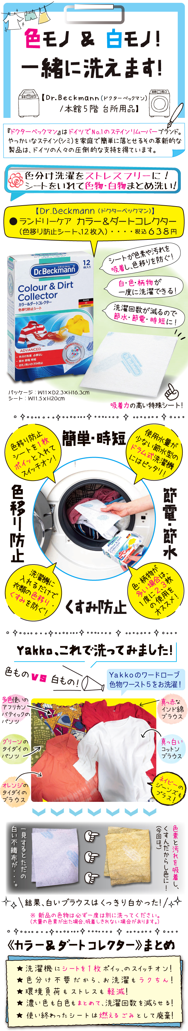 本館5階 台所用品【ドクターベックマン】の『ランドリーケア カラー&ダートコレクター』は、一見ただの白い不織布。コレを洗濯機にポイッと一枚入れるだけで洗濯物から出た色素や汚れを吸着してくれます!この特殊加工のシートのおかげで色物・白物を分けて2回まわしていたお洗濯がまとめて一緒に洗えるんです!(^^)2度のお洗濯が1度で完了するので、節電・節水・時短ができます。洗剤だって半分で済みます!(^^)面倒だ、一緒に洗っちゃえ、と洗濯機を回して、白いシャツがどんどん減ってしまったYakkoやアナタには、朗報です!