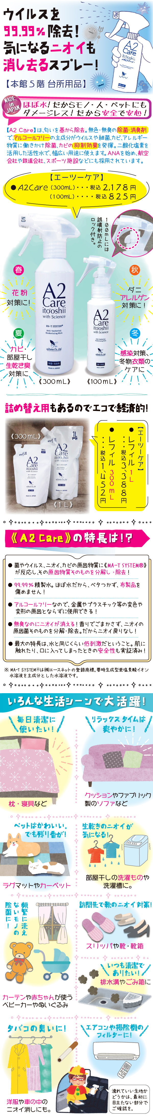 本館5階【台所用品】のハウスキーピングコーナーにある、この『A2 ケア』は、化学薬品の研究開発を行う【株式会社エースネット】と、【ANAグループ】・【全日空商事株式会社】が共同で開発した除菌・消臭スプレー。ニオイの原因物質や菌を狙い撃ちして無臭化、細菌やウイルス・カビに対して、除菌・抗ウイルス・カビ抑制効果を発揮します!
