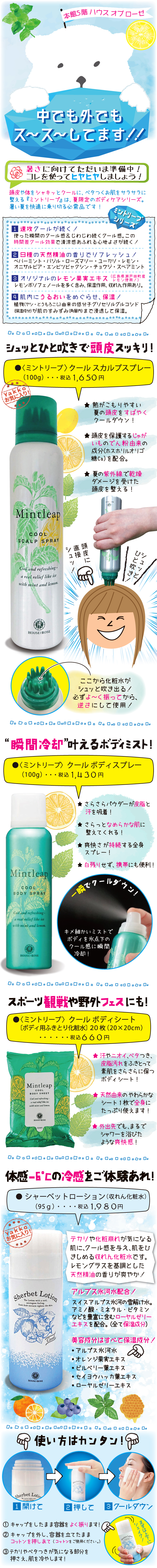 それは、本館5階【ハウス オブ ローゼ】の『ミントリープ』シリーズ!Yakkoのお気に入りは、『クール スカルプスプレー』。よ~く振ったスプレーを逆さにし、頭皮に直接ブシュッとひと吹き。中の頭皮用収れん化粧水が出たかと思ったらすぐに浸透。そのクールさにビックリです!(^^)涼しくなるだけではなく、紫外線でダメージを受けた頭皮を整えてくれます。これからのアツイ季節、帽子を被って頭がムレタリ、お風呂上がりで汗が引かない時にもピッタリ!朝寝起きにシュッとすると、眠い目もばっちり覚めますよ!(^^)