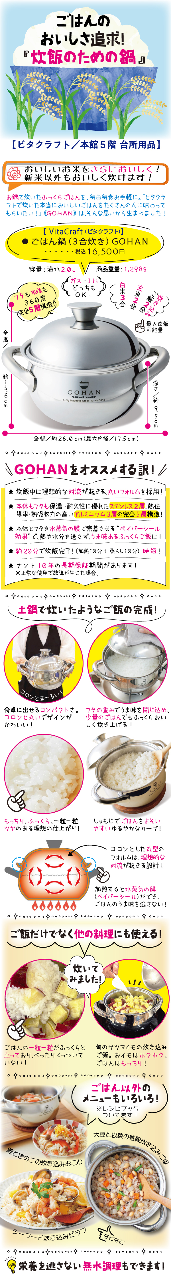 Yakkoは、土鍋や圧力釜でいつもご飯を炊いておりますが、後片付けがちょっと手間。『GOHAN』は、フタと本体だけで、ほかに部品もないので、お手入れもカンタン。コーティングもないので、スポンジでジャンジャン洗え、食器洗浄機も使えます!丸洗いできるから、いつも清潔!(^^)長期間使っても品質が劣化しにくい【ビタクラフト】ですが、安心して使えるよう10年間の保証が付いています。これも安心ですね~。結果コスパ良し。(^^)